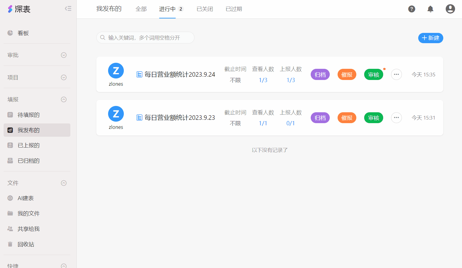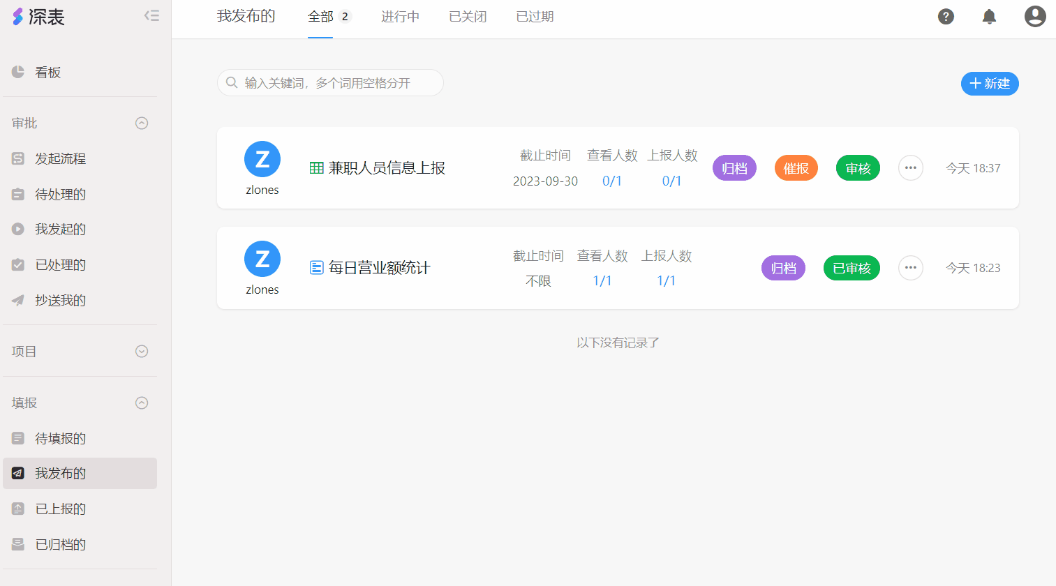 发布的填报任务结束后,如果在「我发布的」任务中不希望将「结束的任务」和「正在进行中的任务」混在一起,可以通过「归档」按钮把已经结束的任务统一放到「已归档的」。当某个填报任务需要从「已归档的」中恢复填报时,也可以点击「撤销归档」按钮,将任务移回「我发布的」中。
