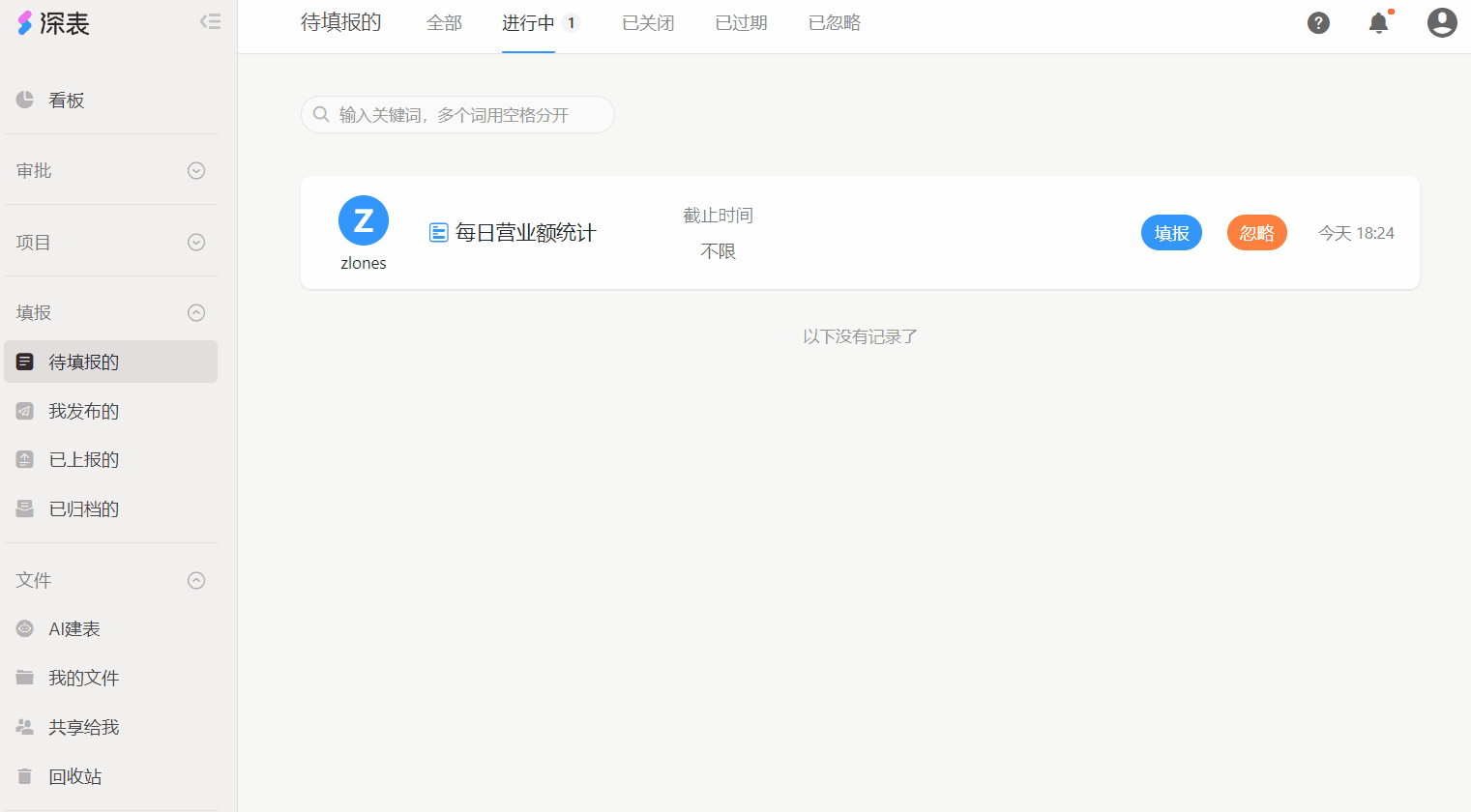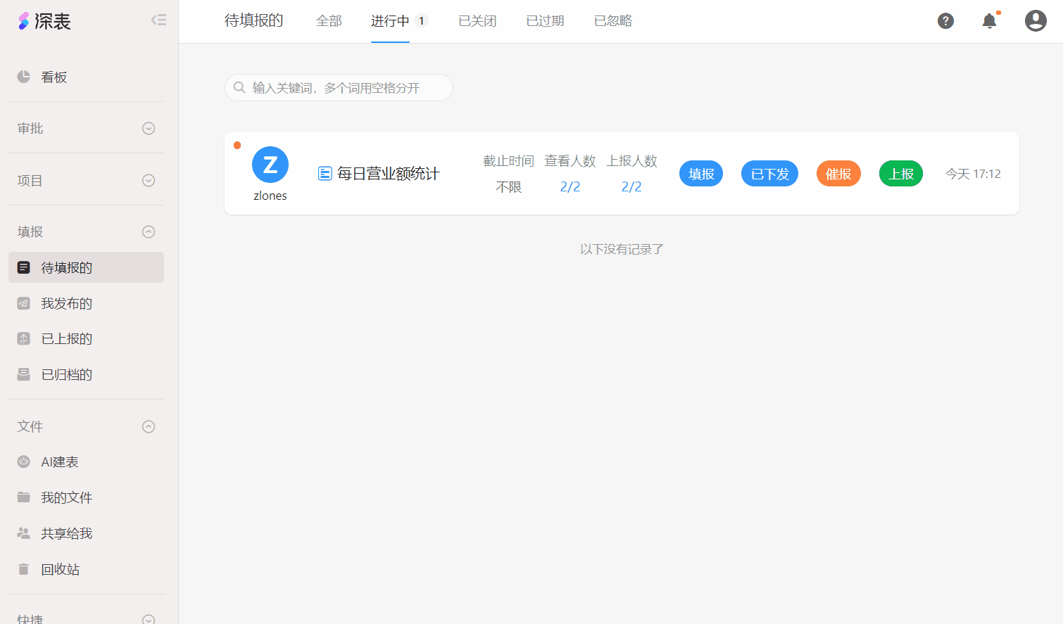通过多层级下发后,从下向上层层上报,最终完成全部据数填报。在「待填报的」某个任务中点击「填报」按钮,填报完成点击「上报」按钮完成填报任务上报,如果是中间审核人「下发」给了下一级并且下一级也已经上报时,需要点击「上报」按钮来完成数据审核与整体数据的上报。