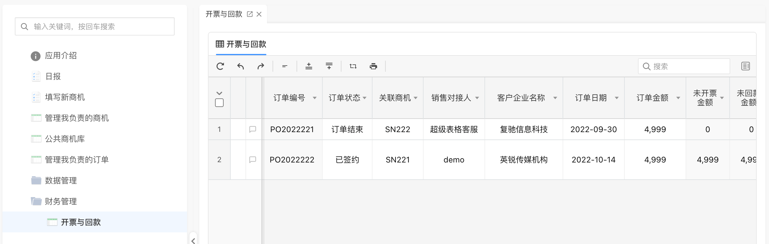 详细记录客户订单的每笔开票与回款等相关信息,用于企业资金流转数据统计与管理,也便于日后的查询和分析。